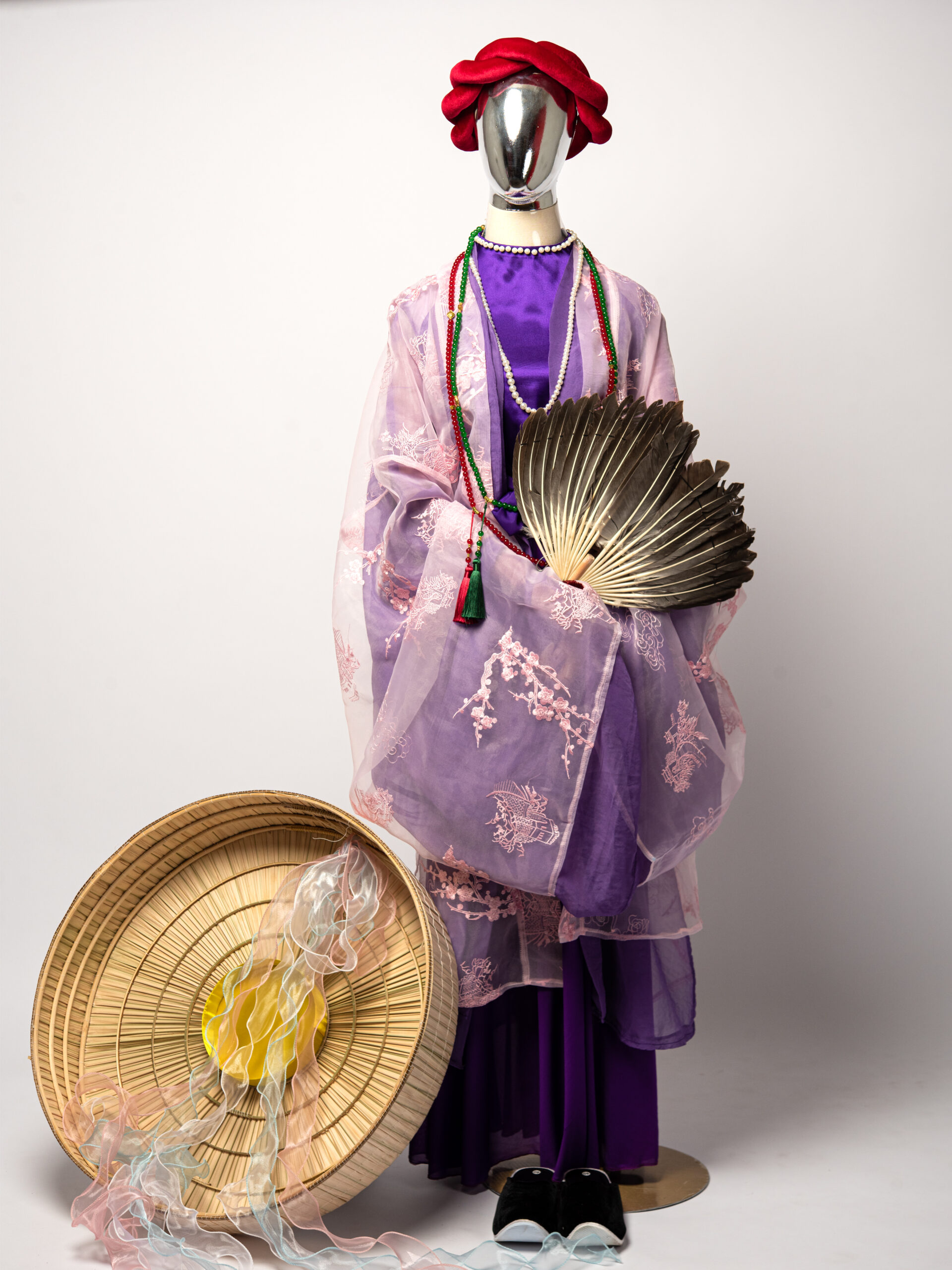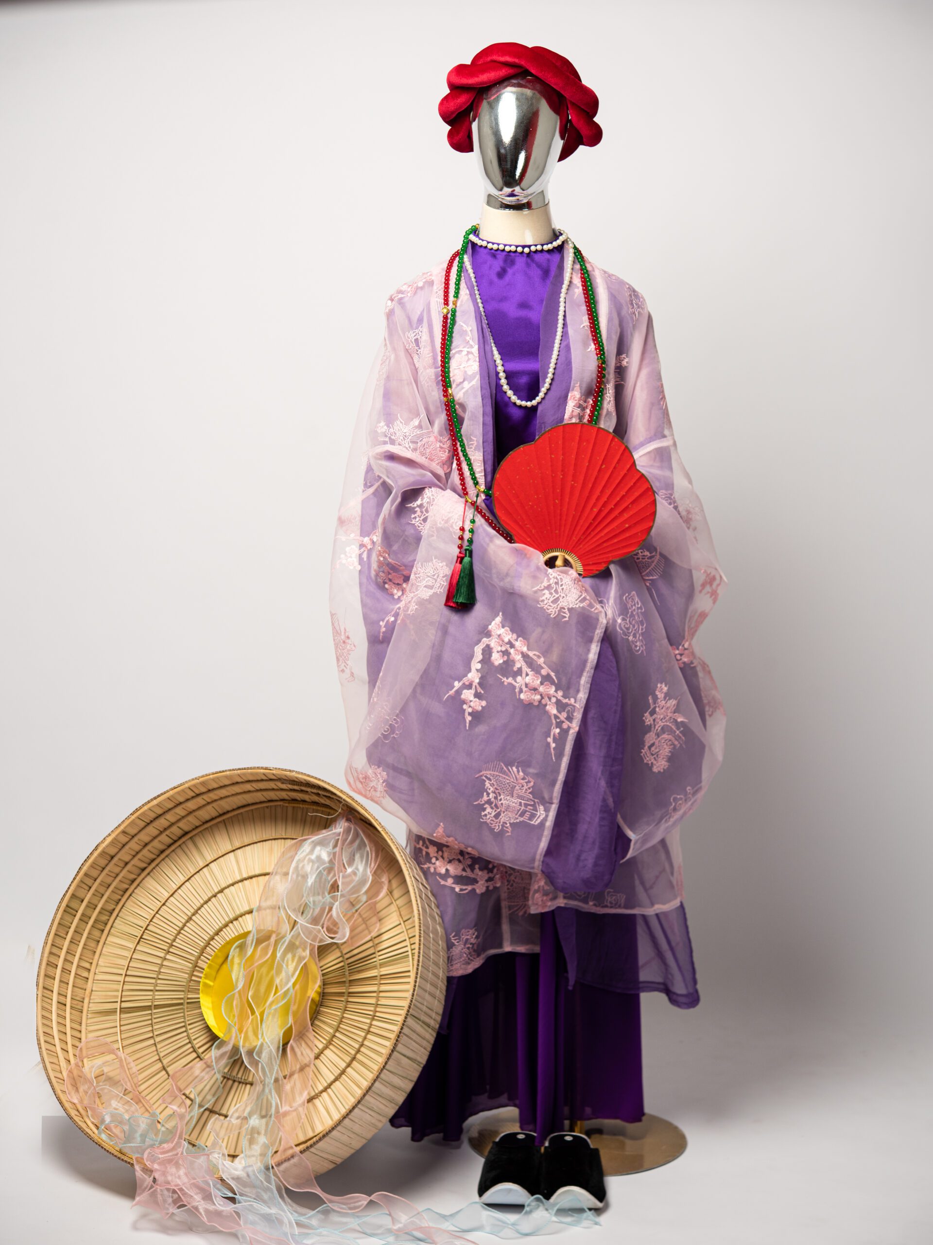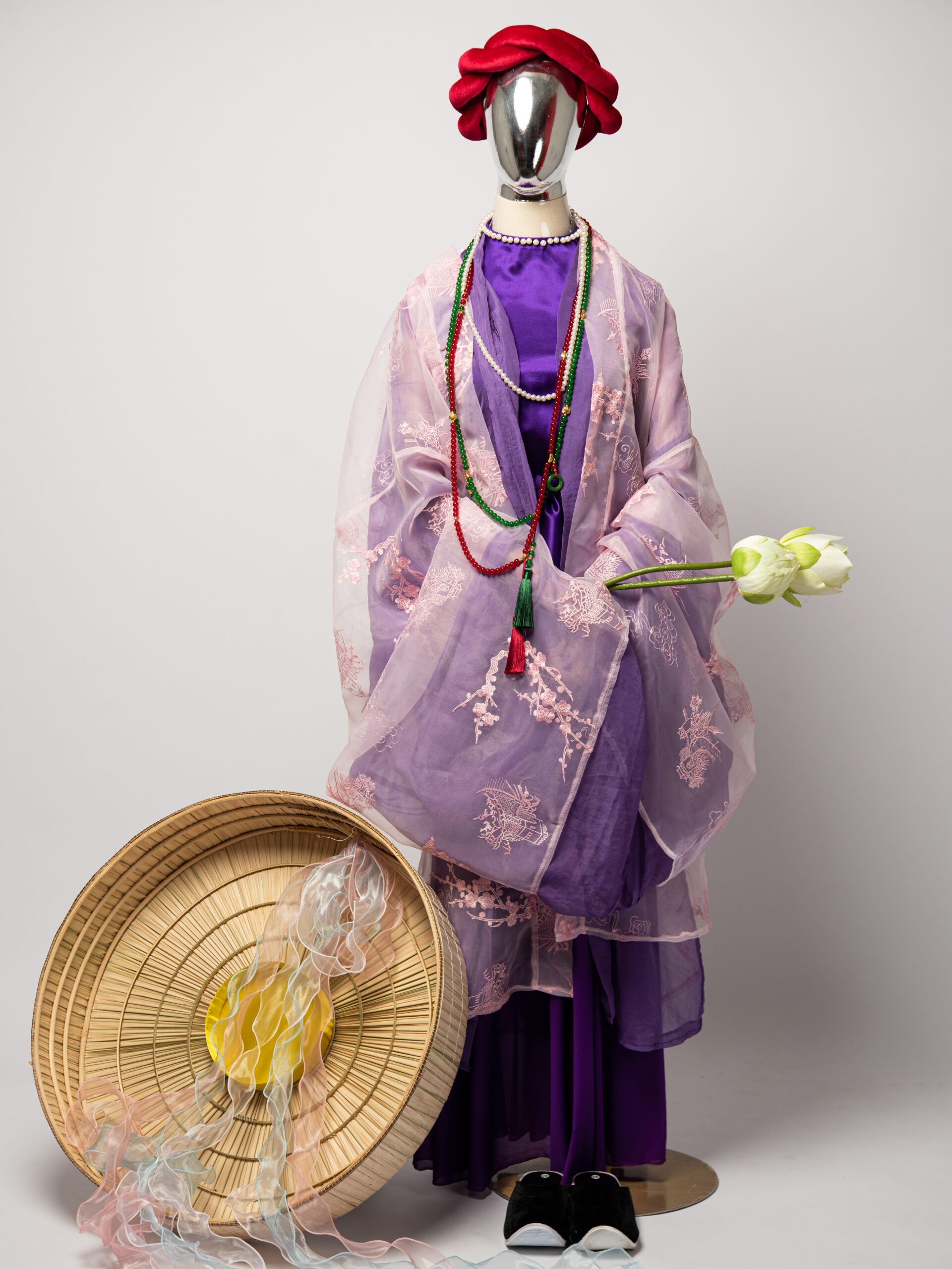 Bộ trang phục truyền thống Việt Nam cho nữ – Áo Đối Khâm màu hồng nhạt thêu cành đào (khoác ngoài), phối cùng áo Giao Lĩnh màu tím và yếm đụp màu ghi.