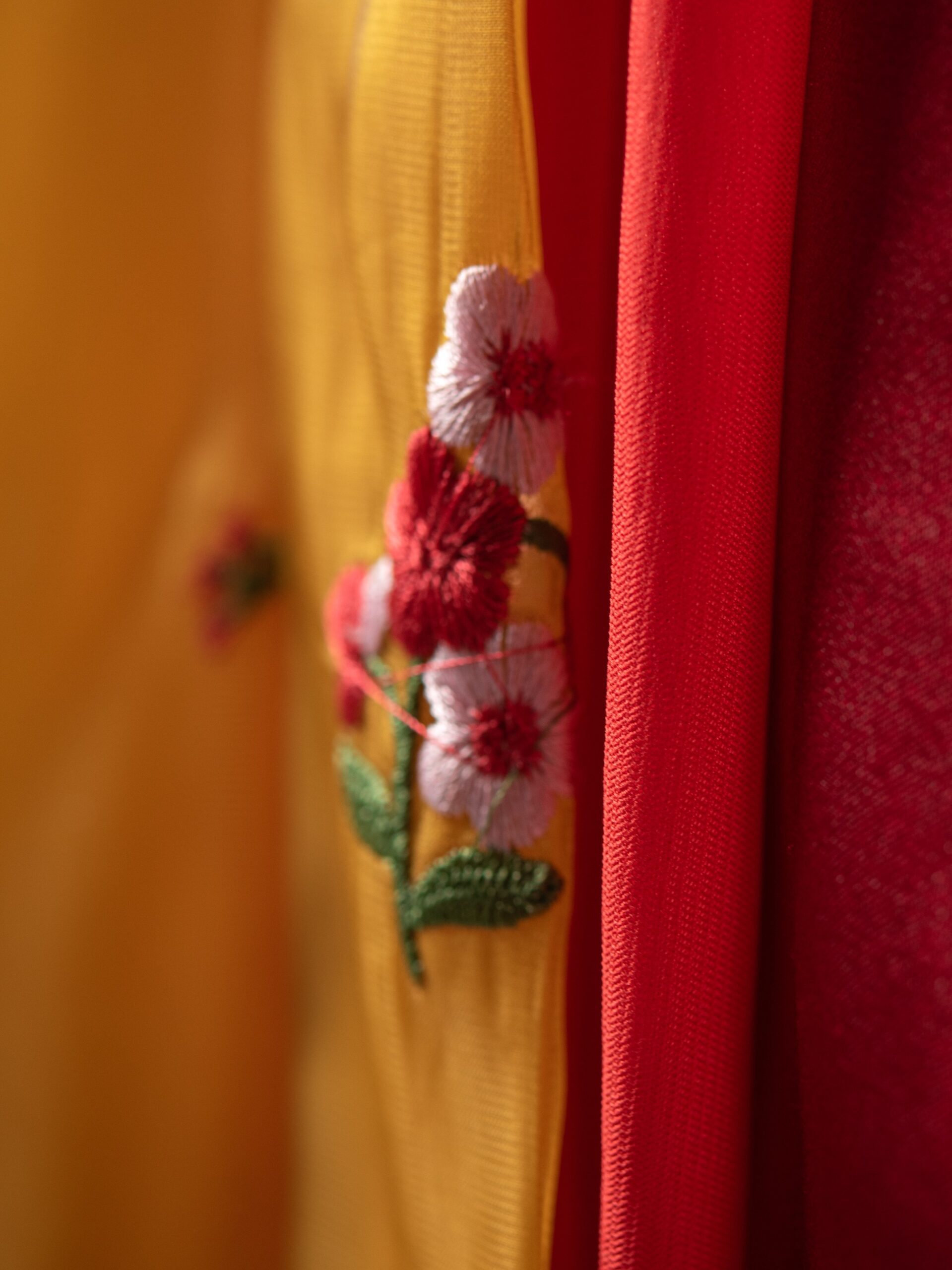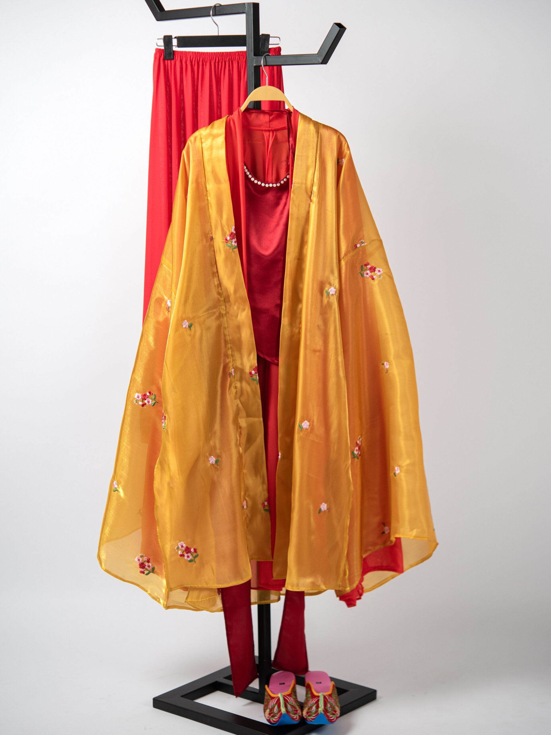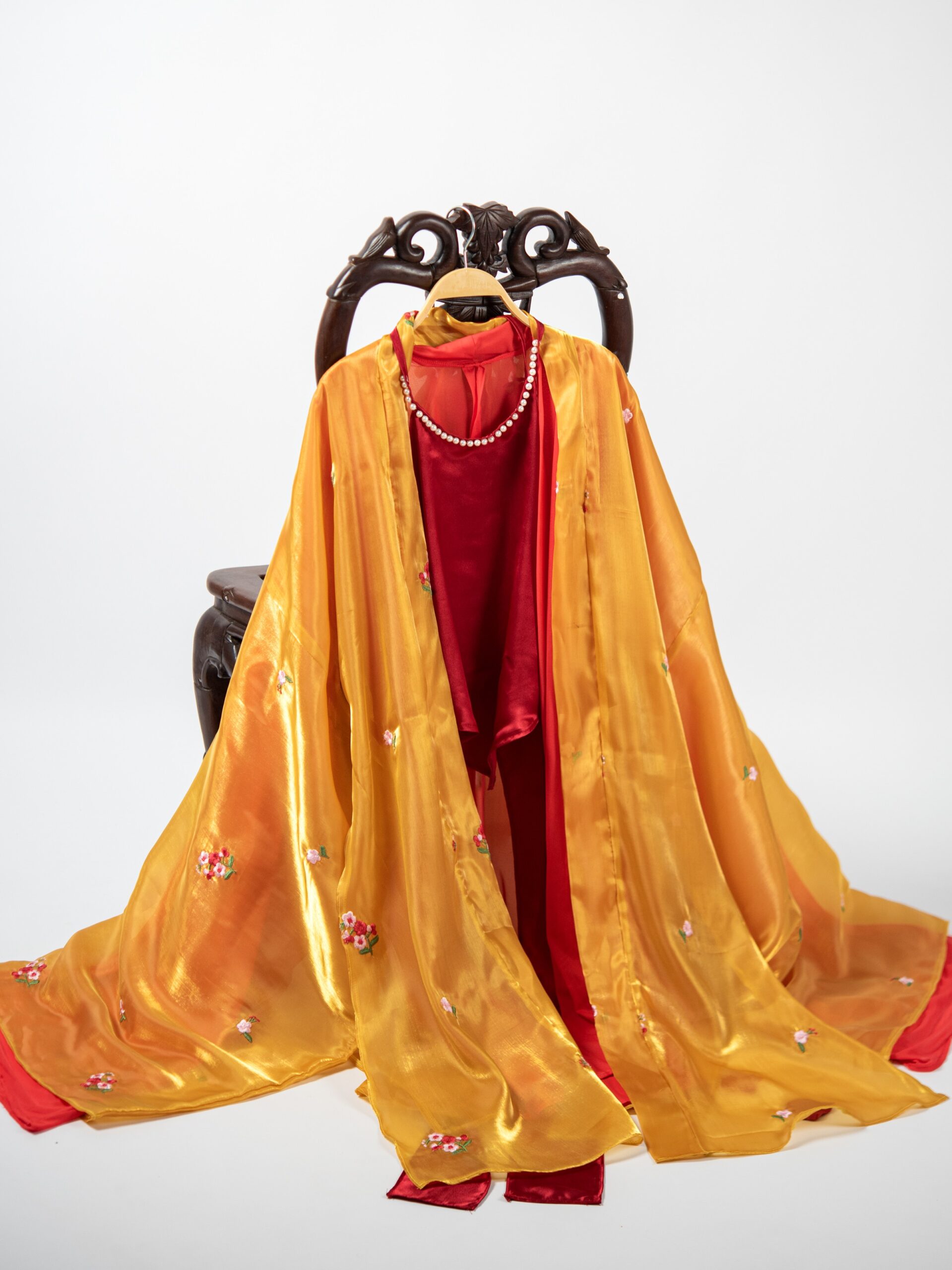 Bộ áo Đối Khâm vàng cam thêu hoa – áo Giao Lĩnh đỏ – yếm đụp đỏ