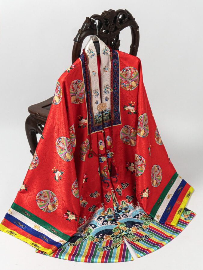 Bộ trang phục truyền thống Việt Nam: áo Nhật Bình cho nữ màu đỏ đậm, chất liệu gấm thêu hoa văn phượng ổ.
