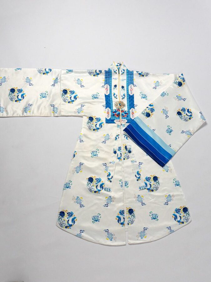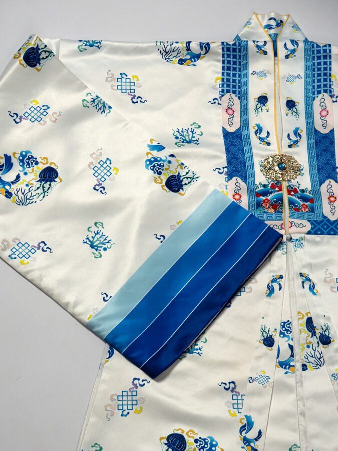 Xuất hiện xuyên suốt trên nền áo, biểu trưng cho may mắn, tài lộc và sự thăng tiến. Trong văn hóa Á Đông, cá chép còn mang ý nghĩa vượt khó, hóa rồng – rất phù hợp với tinh thần phát triển và vươn lên. - Hoa văn thủy ba (sóng nước) ở chân váy