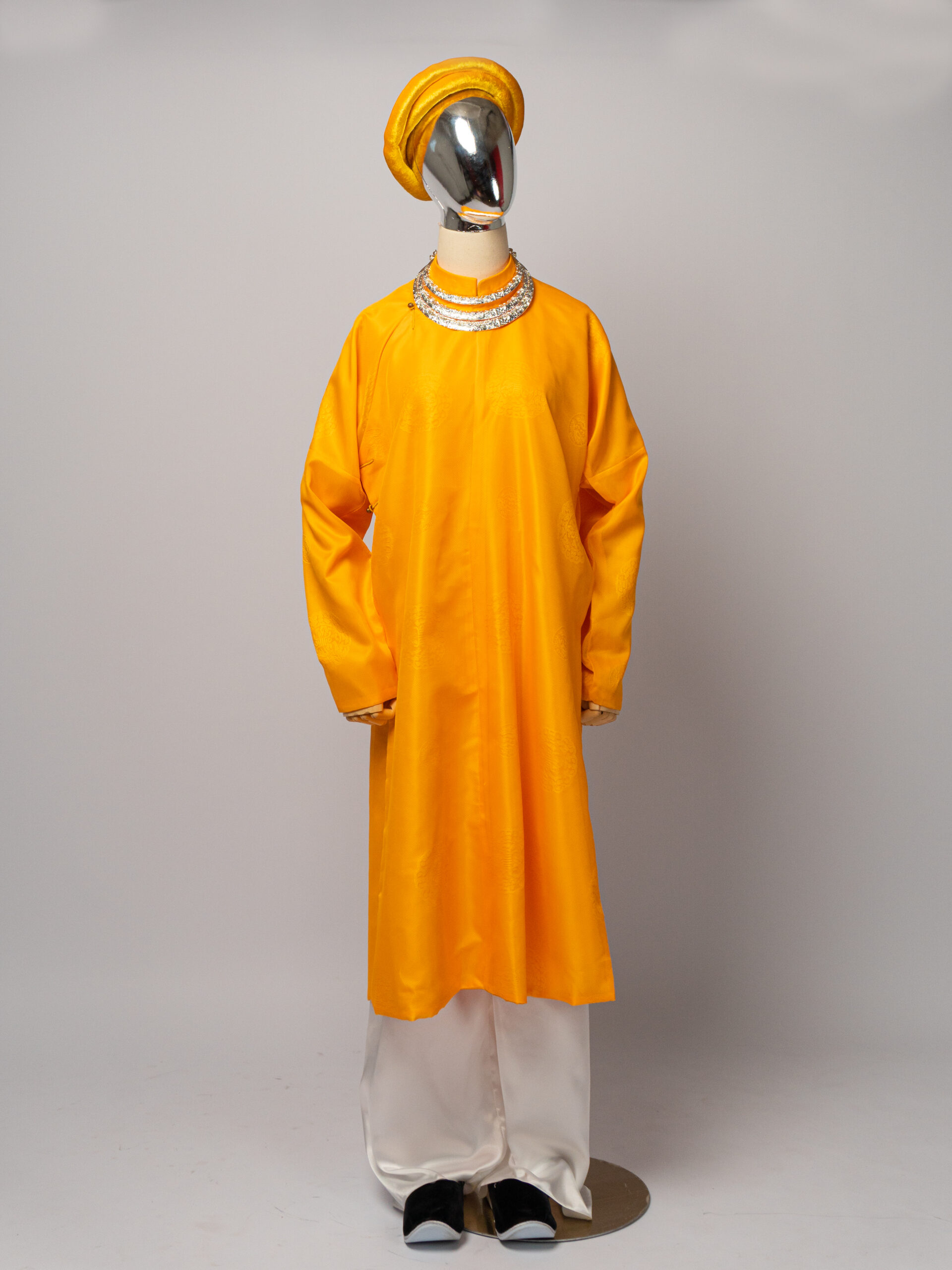 Bộ áo Ngũ Thân nam – vàng, chất liệu gấm thêu chìm hoa văn rồng chầu