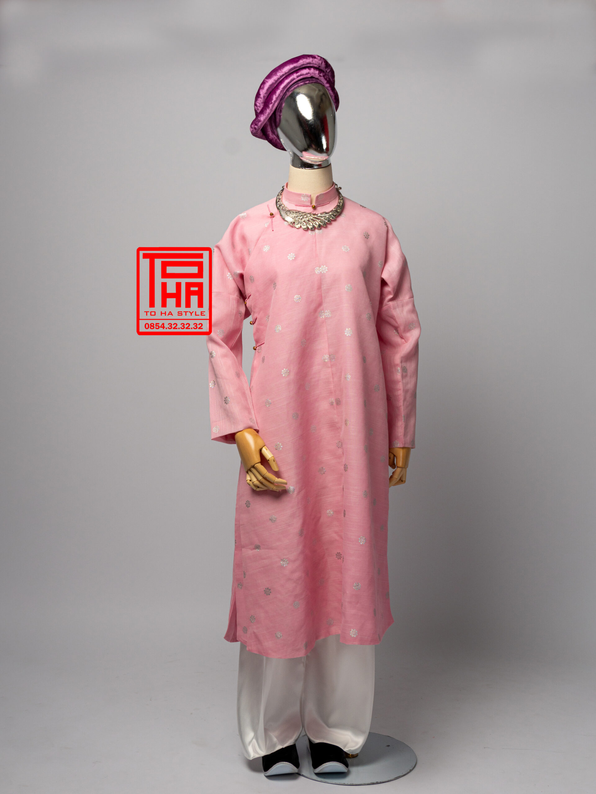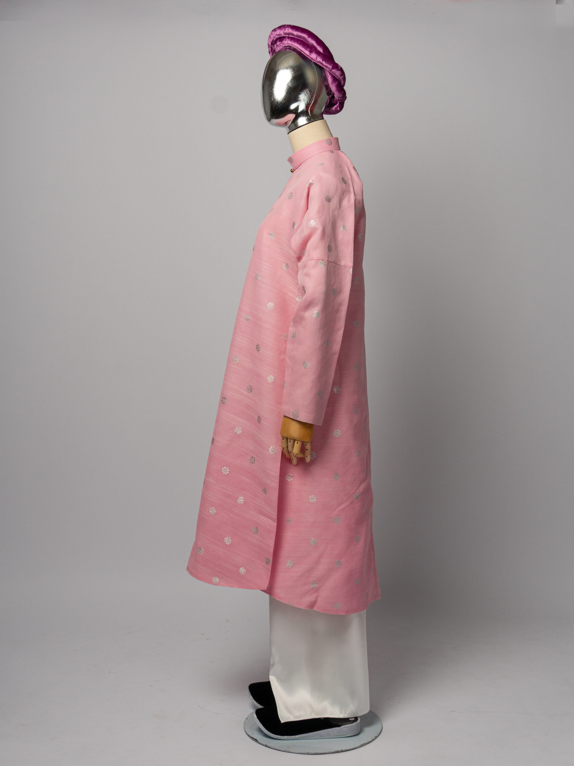 Bộ áo Ngũ Thân nữ – hồng phấn, chất liệu gấm họa tiết hoa văn cát tường