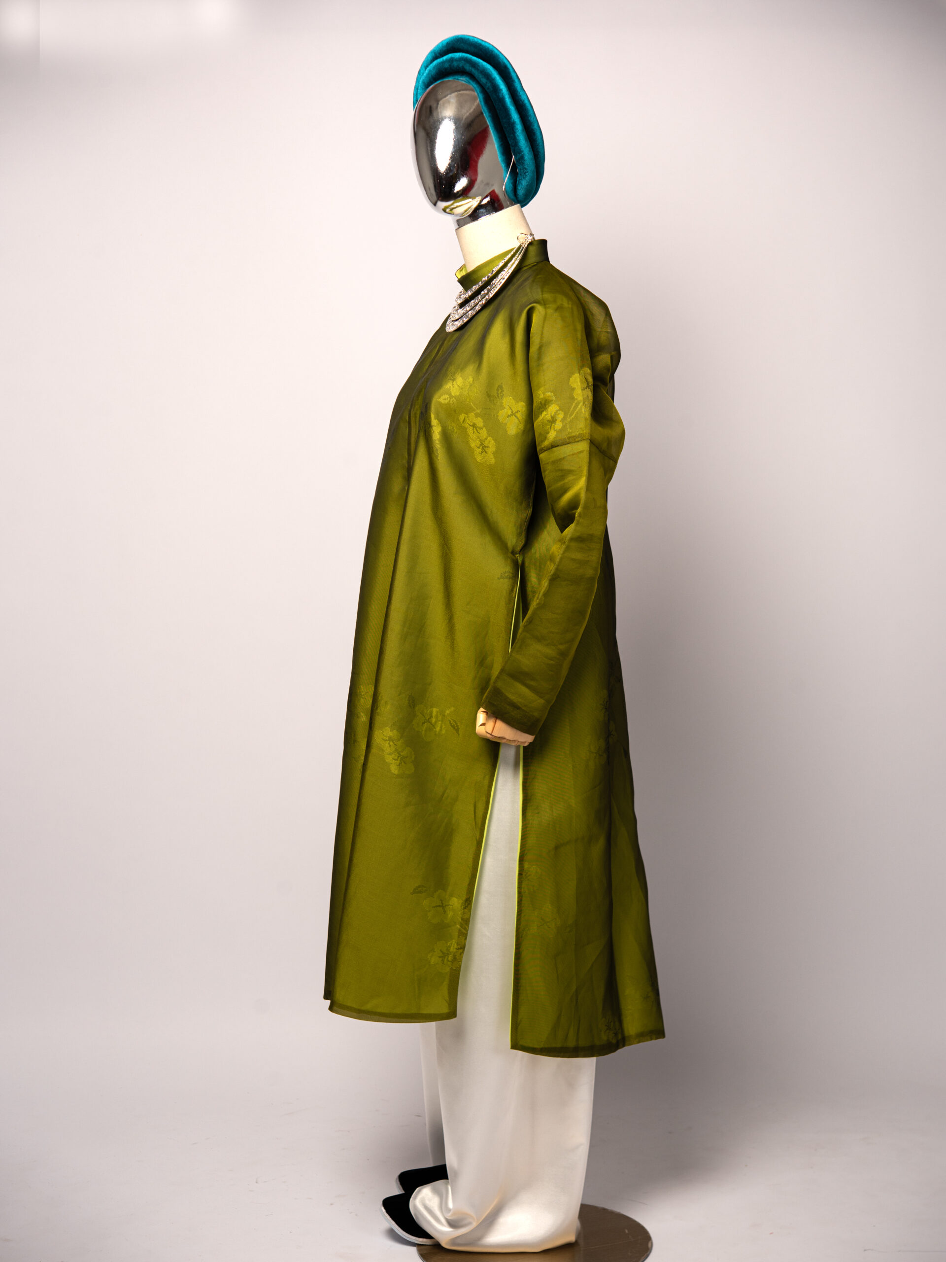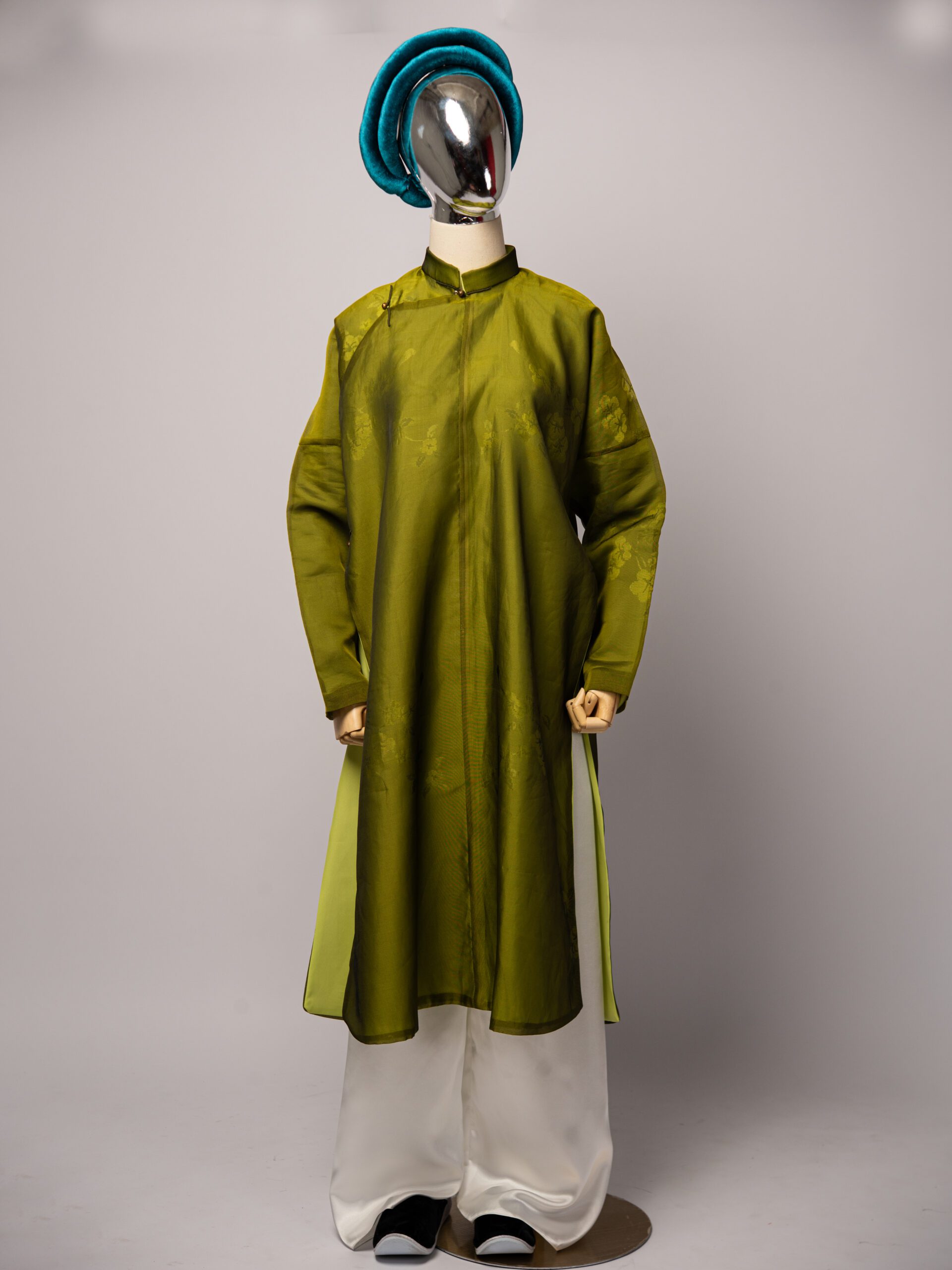 Bộ áo Ngũ Thân – Xanh rêu cổ điển, chất liệu gấm thêu chìm họa tiết hoa mai