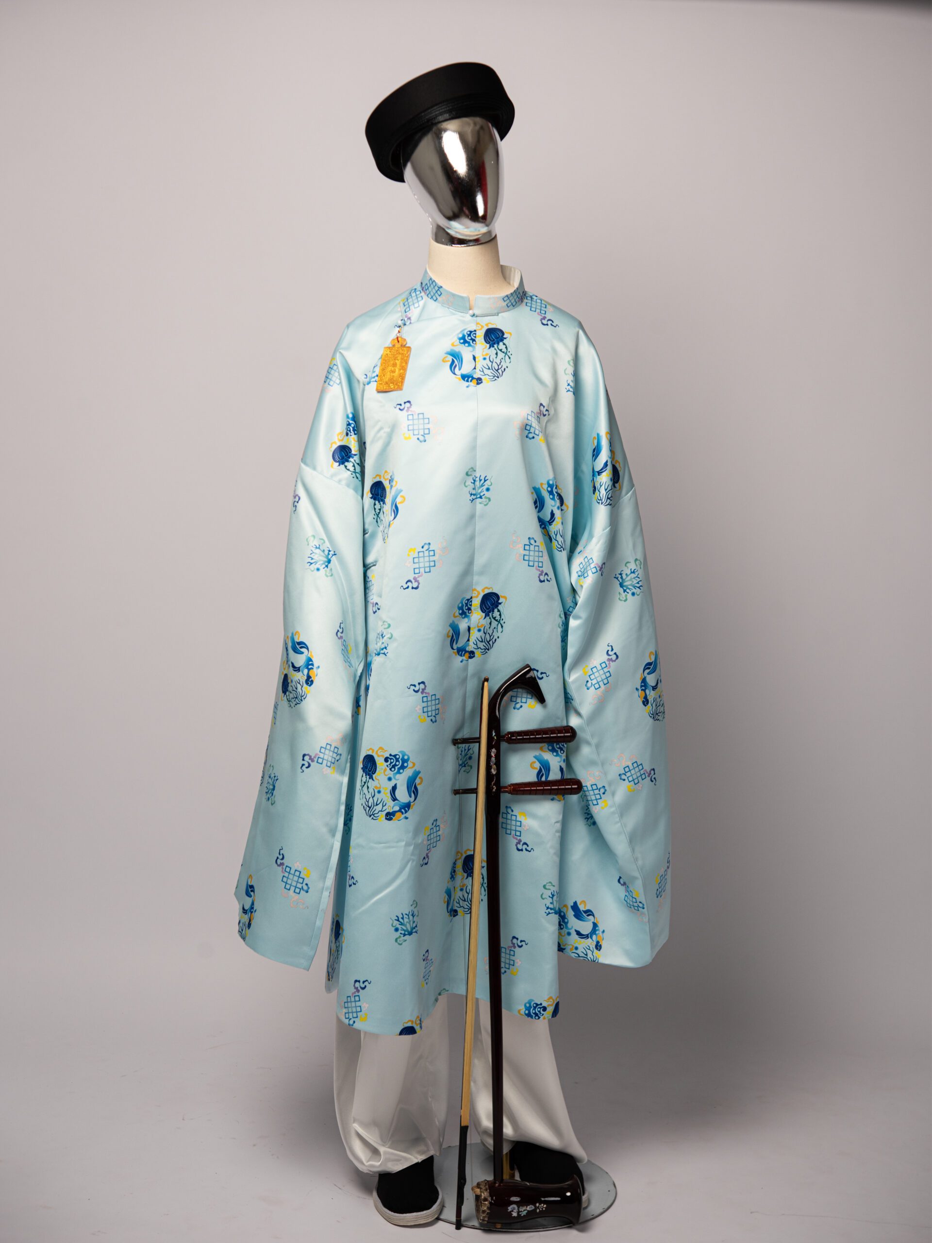 Bộ áo Tấc nam – xanh ngọc lam nhạt, chất vải tafta in họa tiết hải ngư thủy mẫu