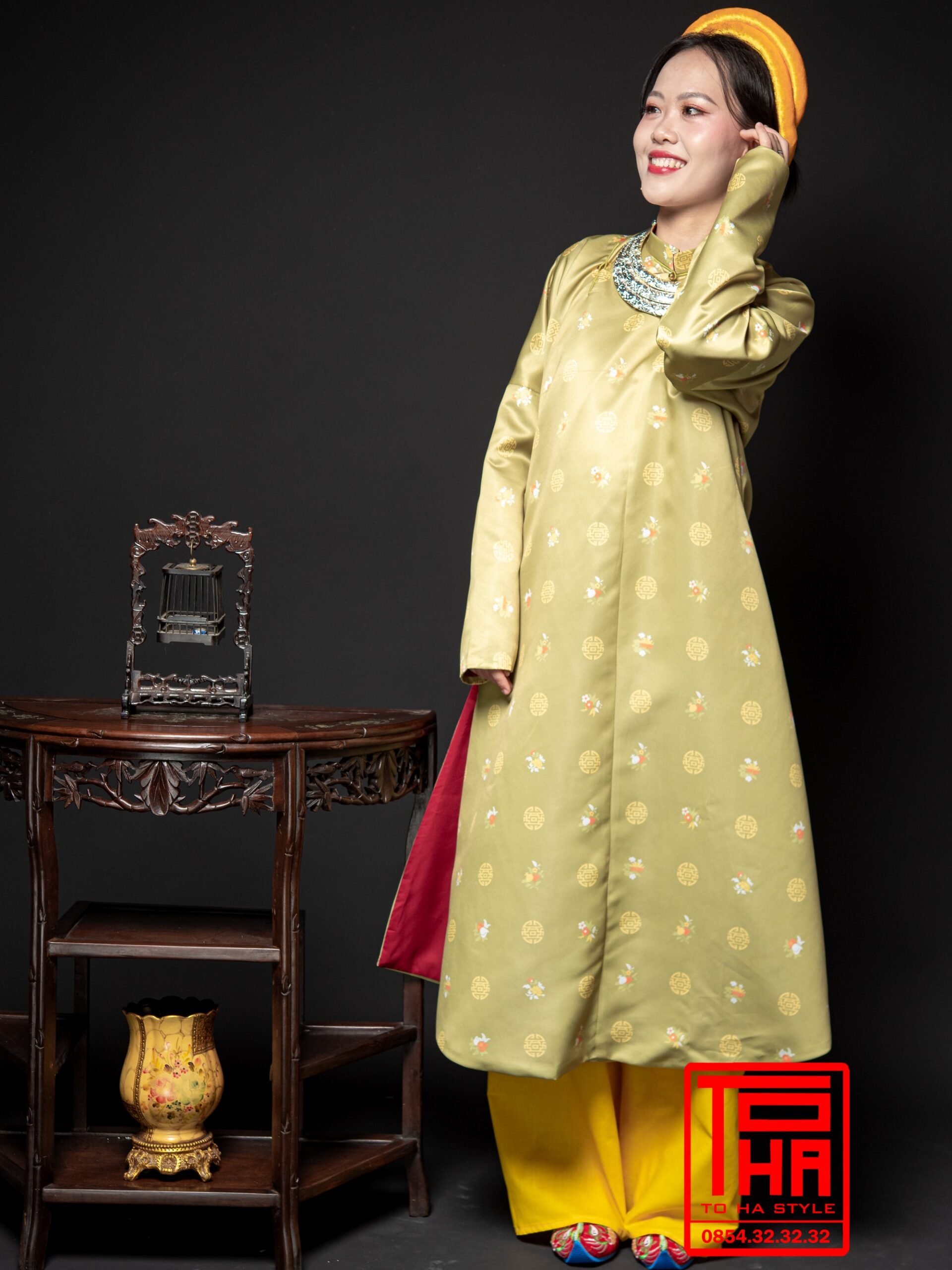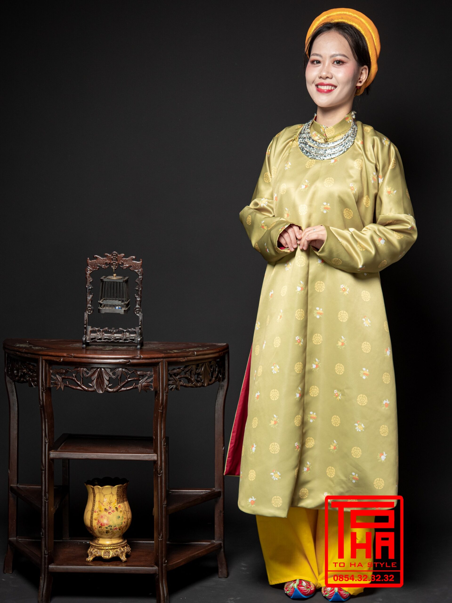 Cho thuê áo Ngũ Thân nữ – vàng nhạt, chất liệu gấm thêu hoa văn cát tường