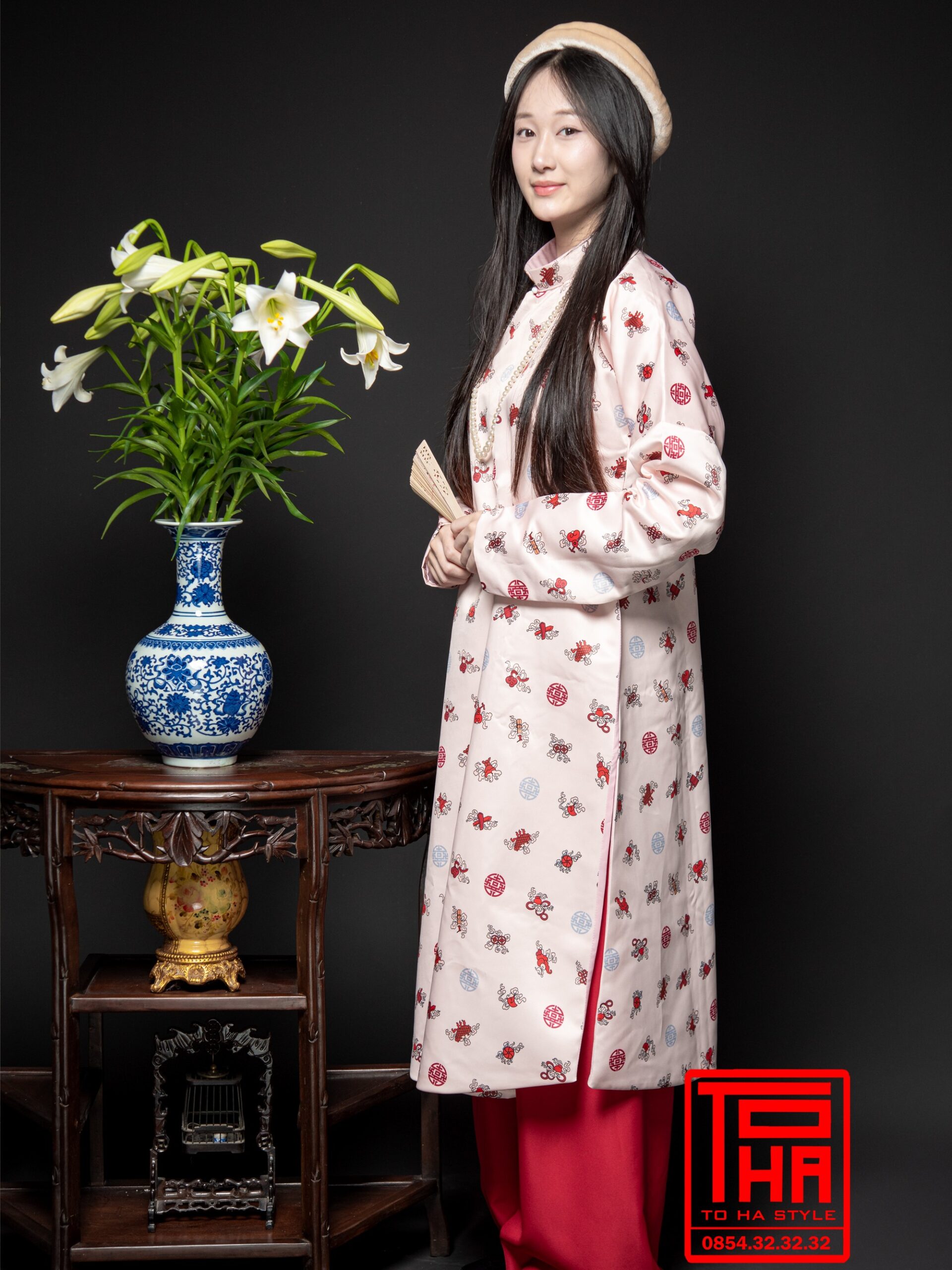 Cho thuê áo Ngũ Thân – trắng kem, chất liệu vải tafta in họa tiết linh vân và triện đỏ