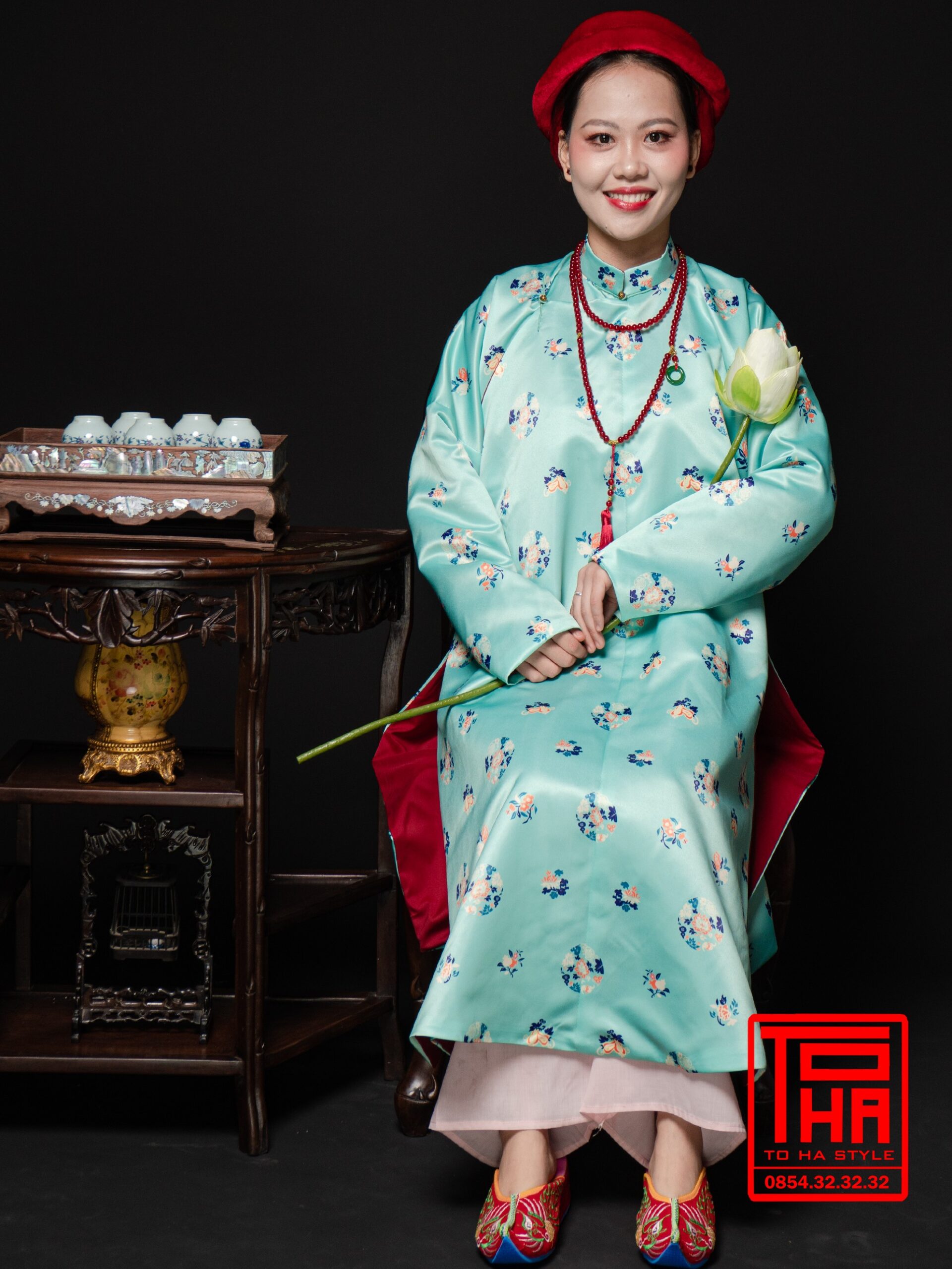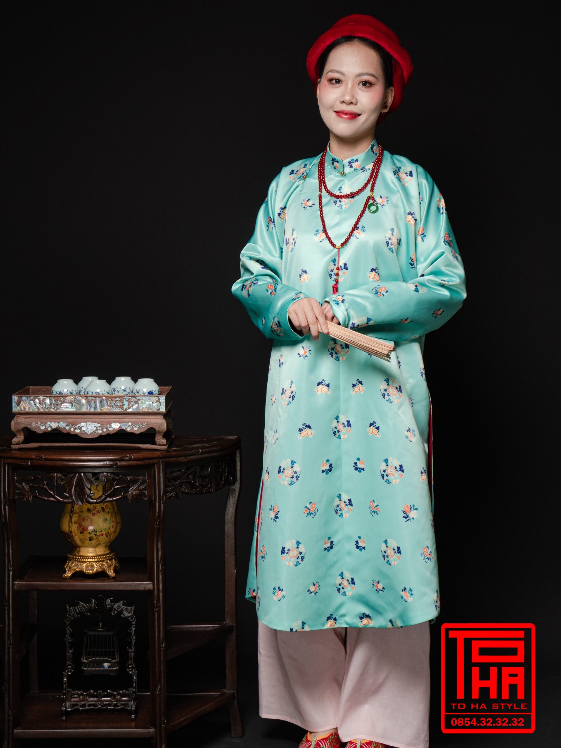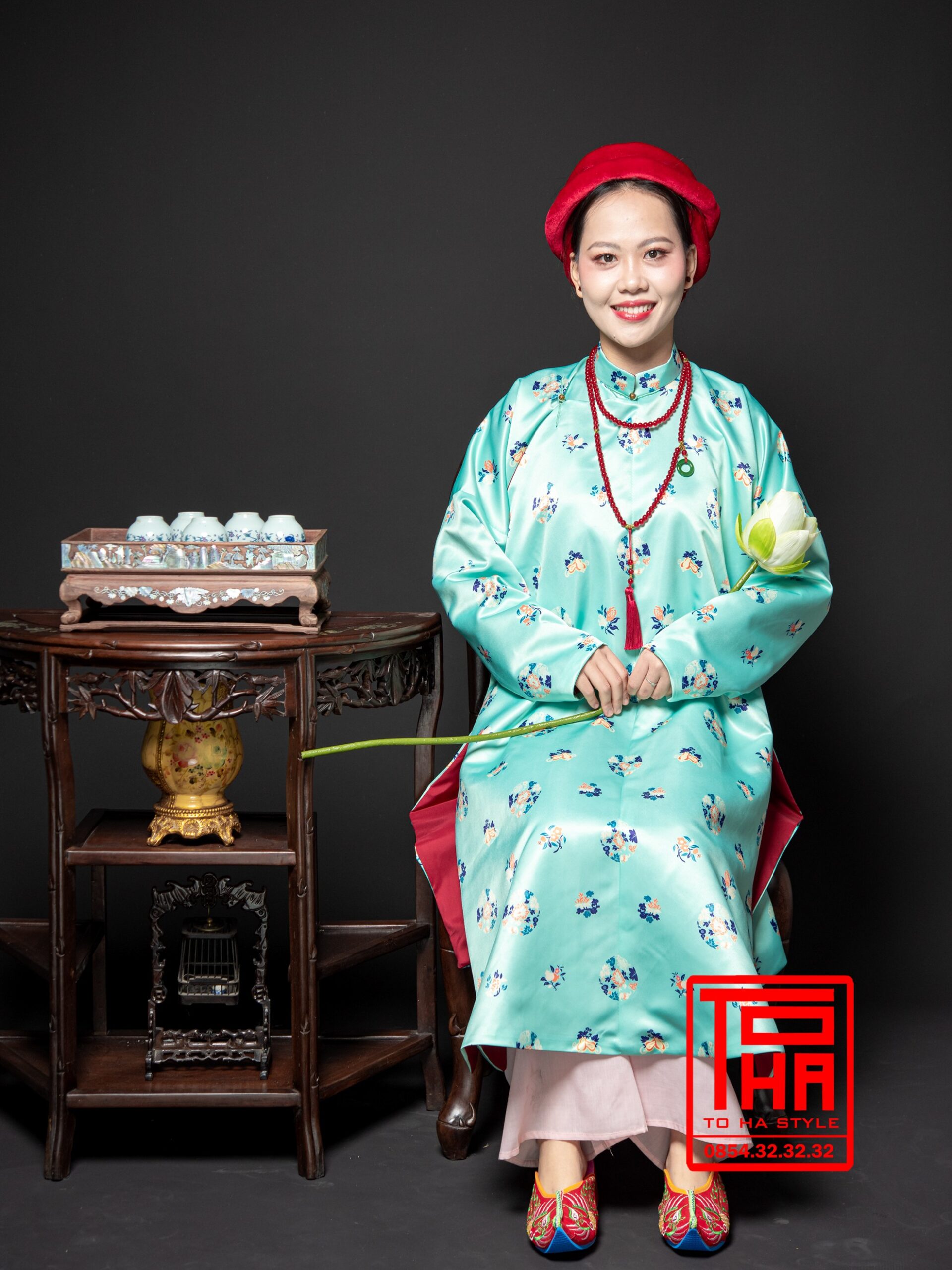 Cho thuê áo Ngũ Thân – Xanh ngọc, chất vải tafta in hình họa tiết hoa lá cách điệu