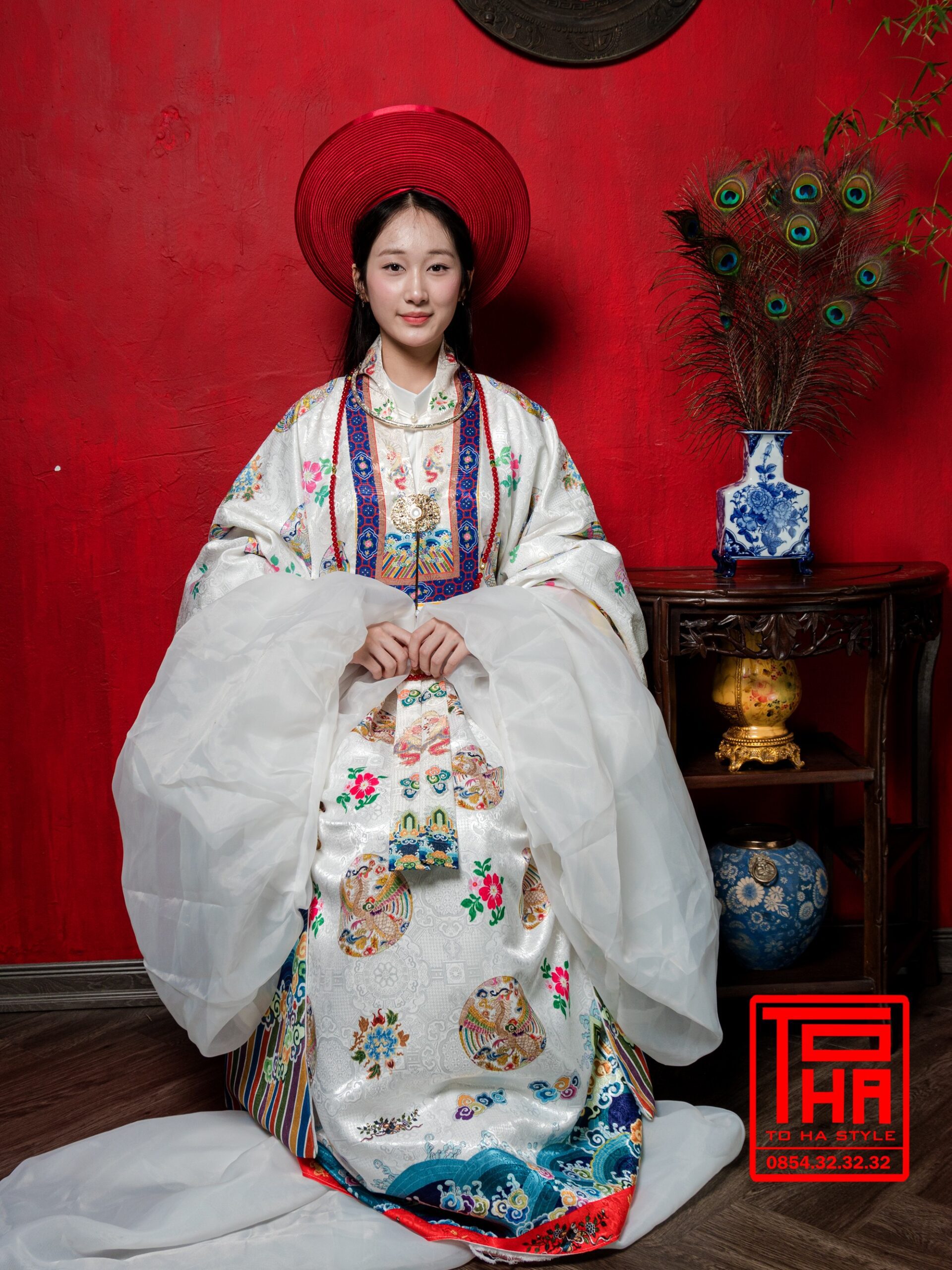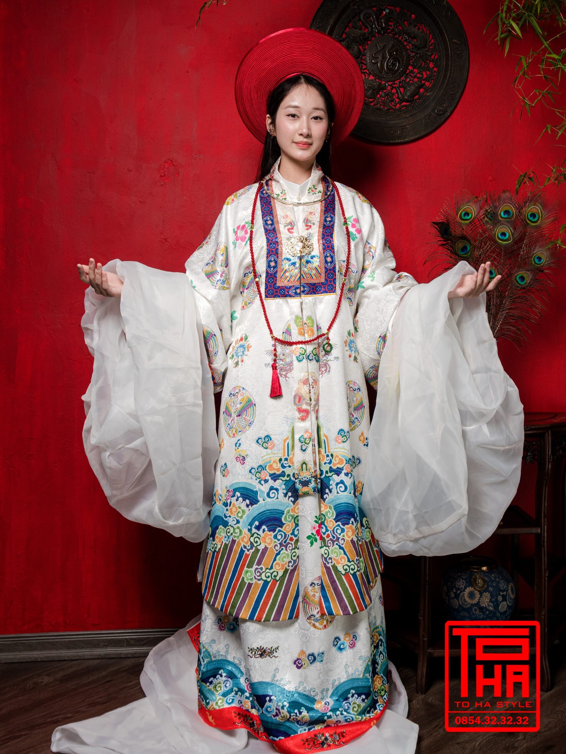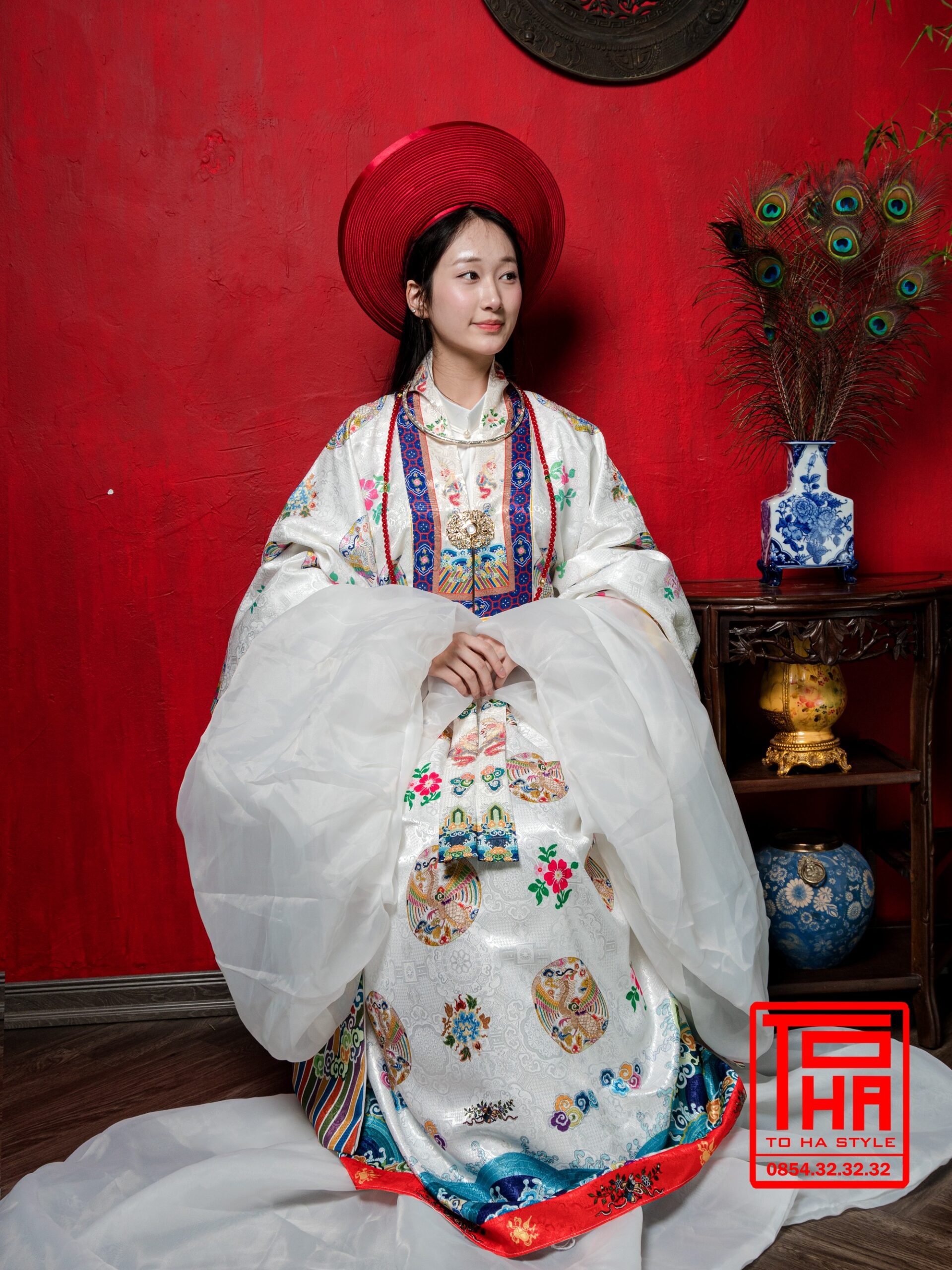 Bộ áo Nhật Bình cao cấp với họa tiết cung đình là sự kết tinh giữa truyền thống và sáng tạo – nơi mỗi chi tiết đều được chăm chút để tái hiện tinh thần hoàng gia theo một cách gần gũi hơn với người mặc hôm nay.