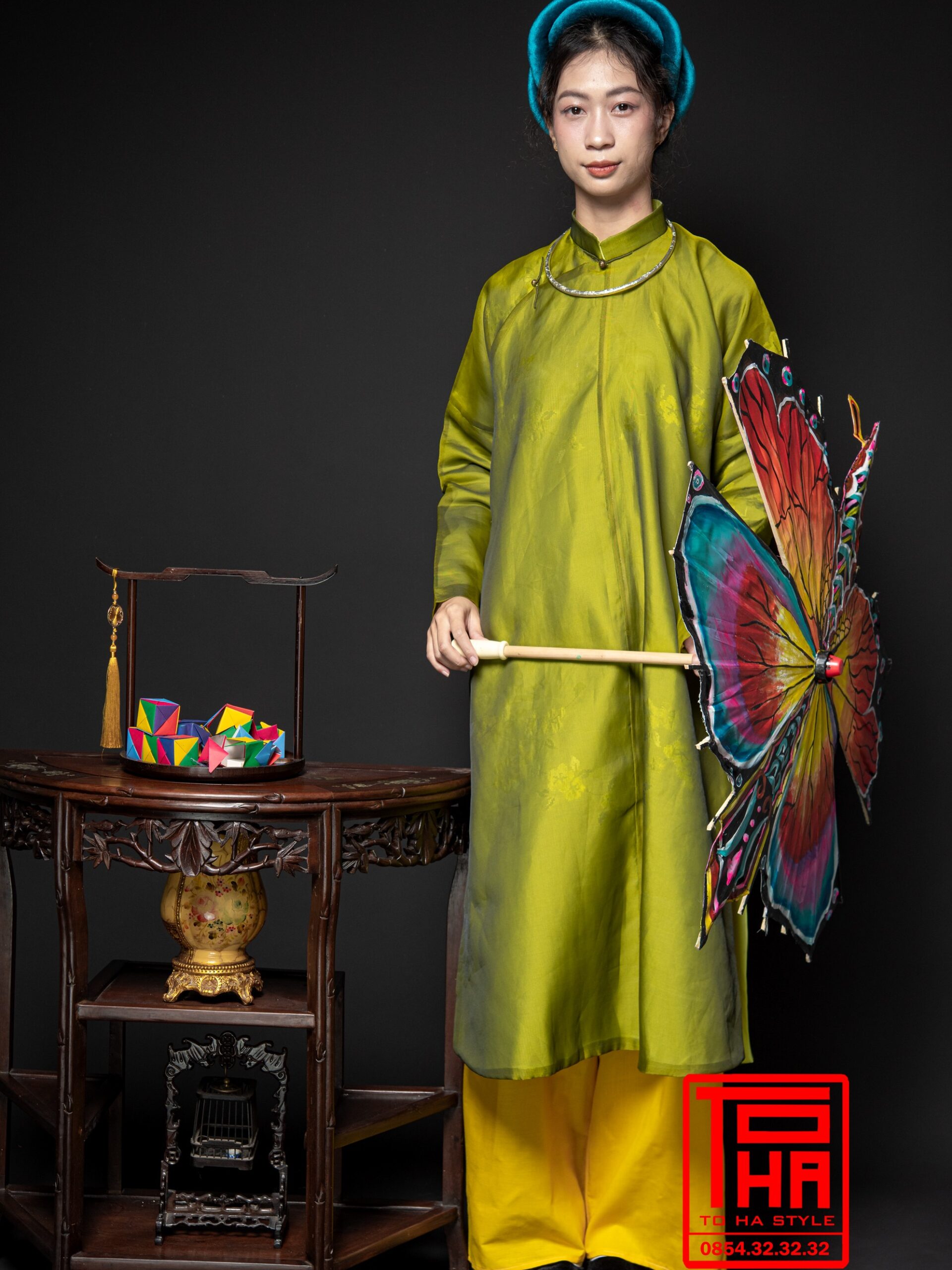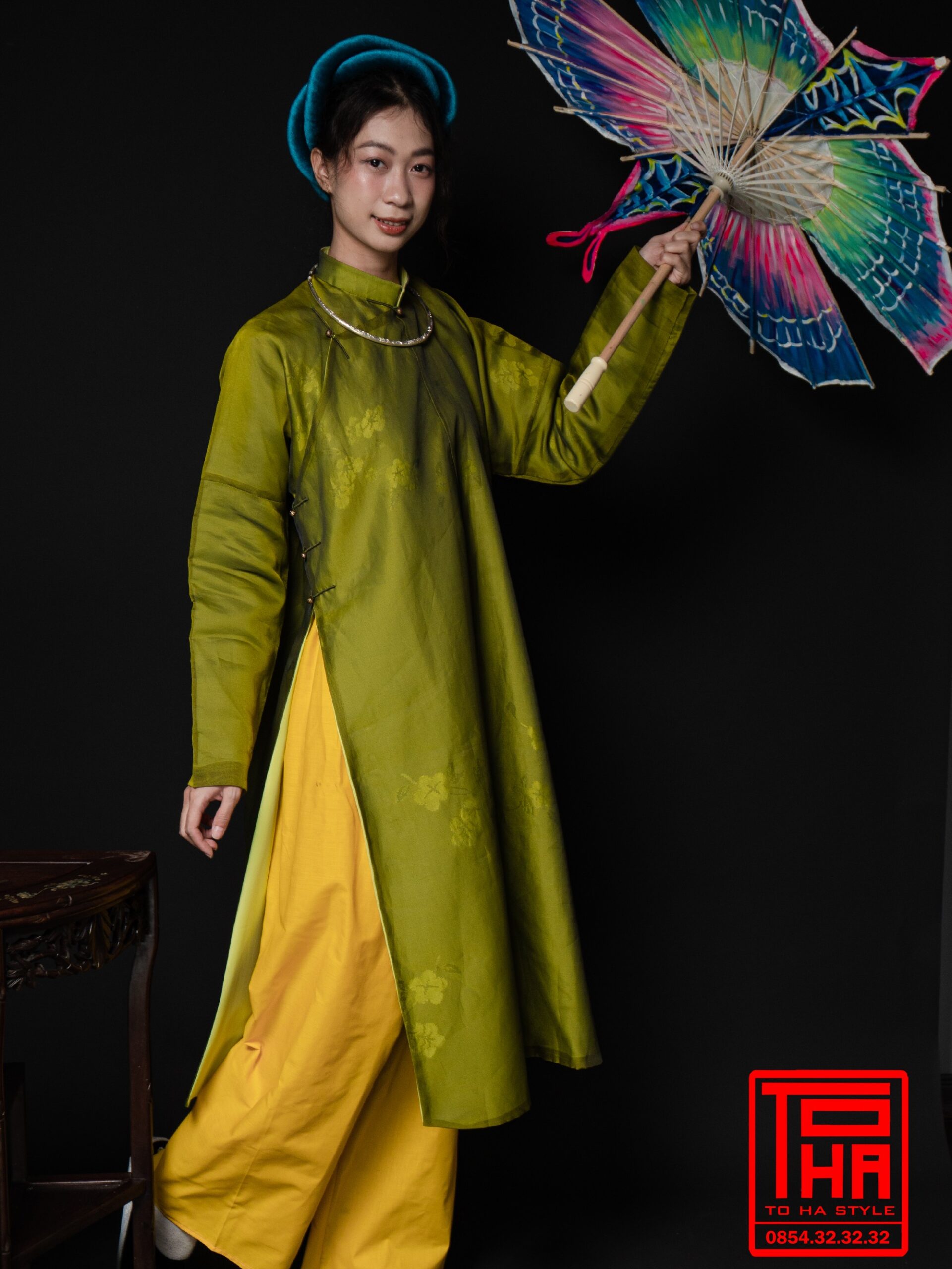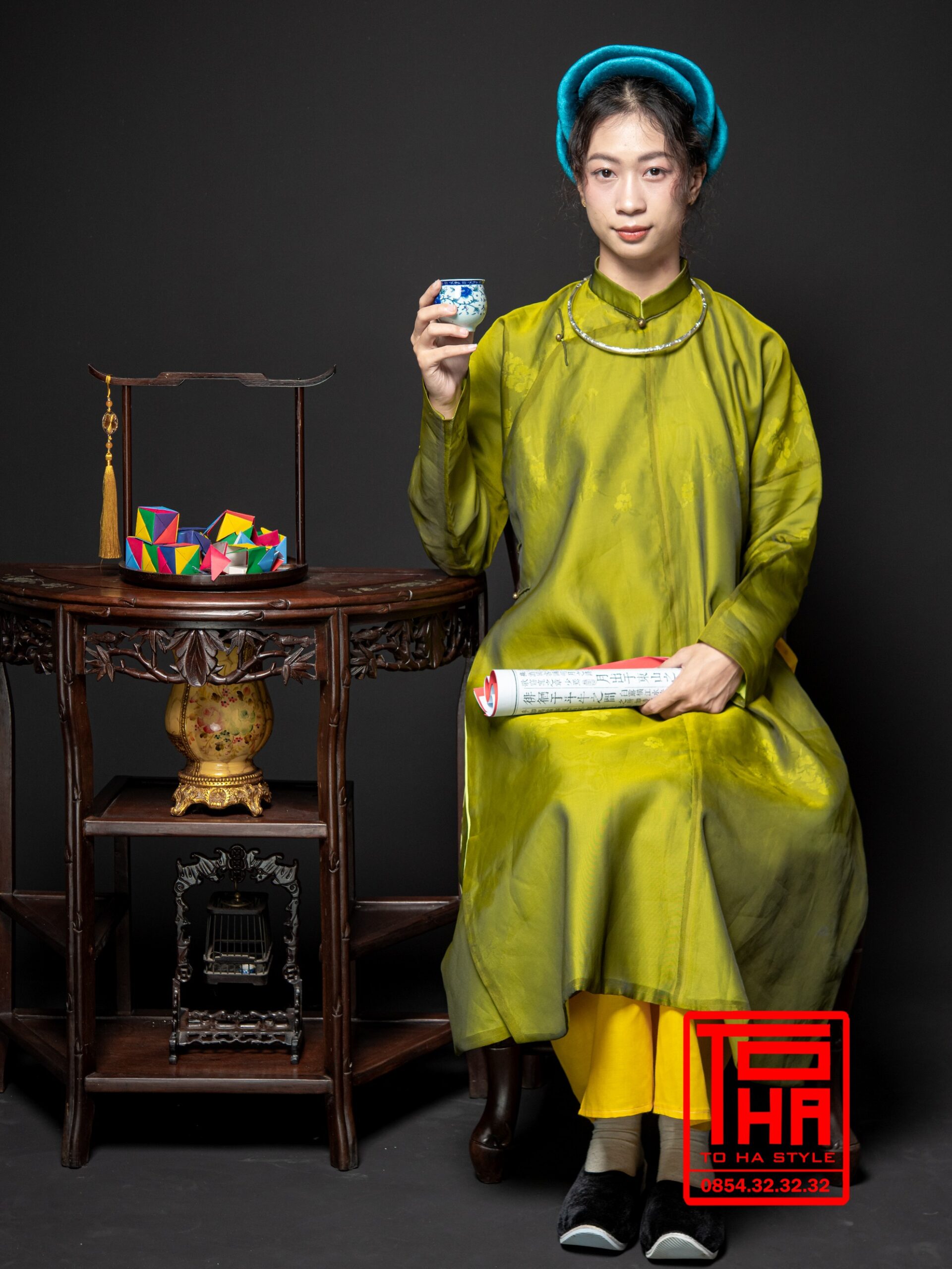 Cho thuê bộ áo Ngũ Thân Nữ – Xanh rêu cổ điển, chất liệu gấm thêu hoa mai