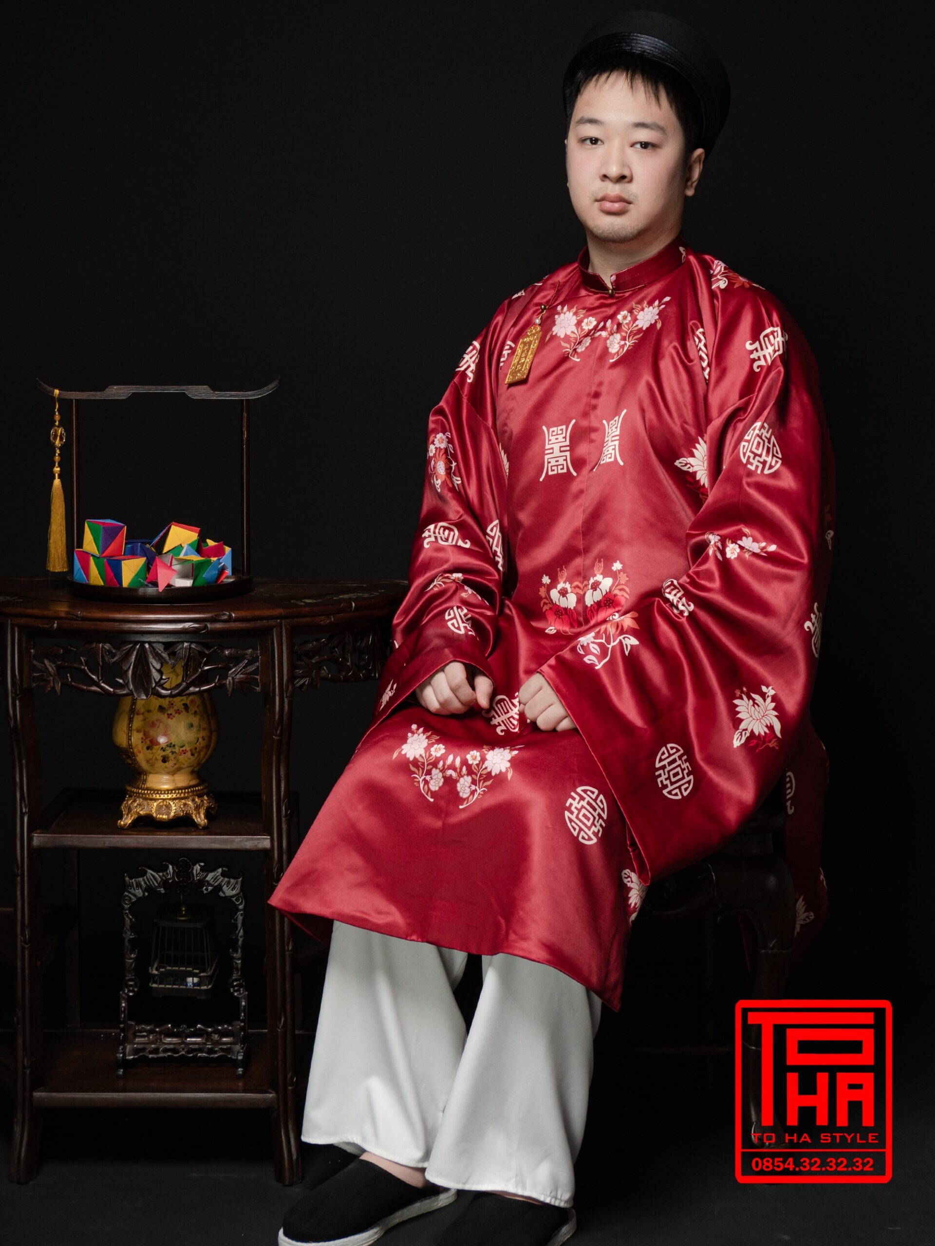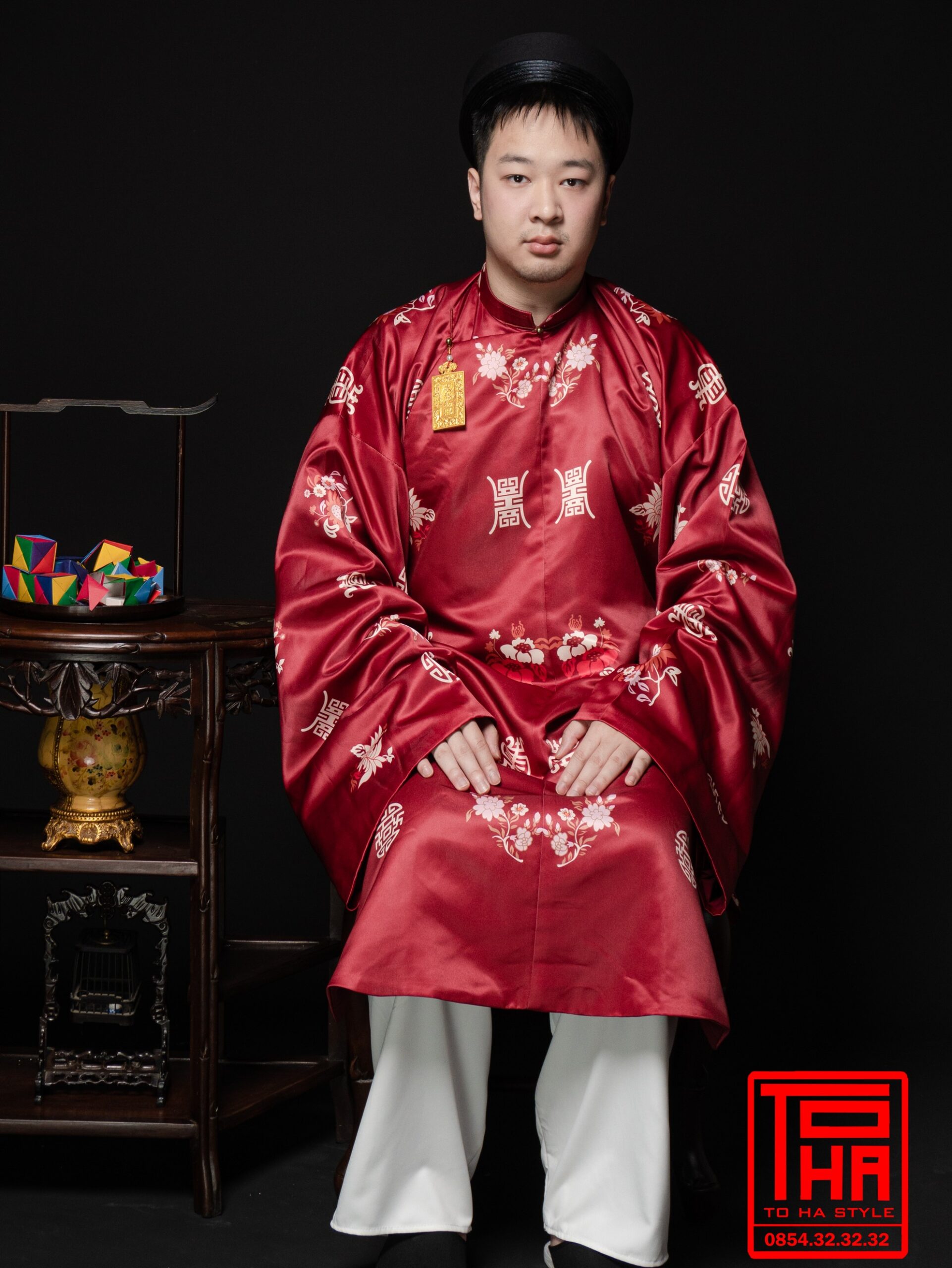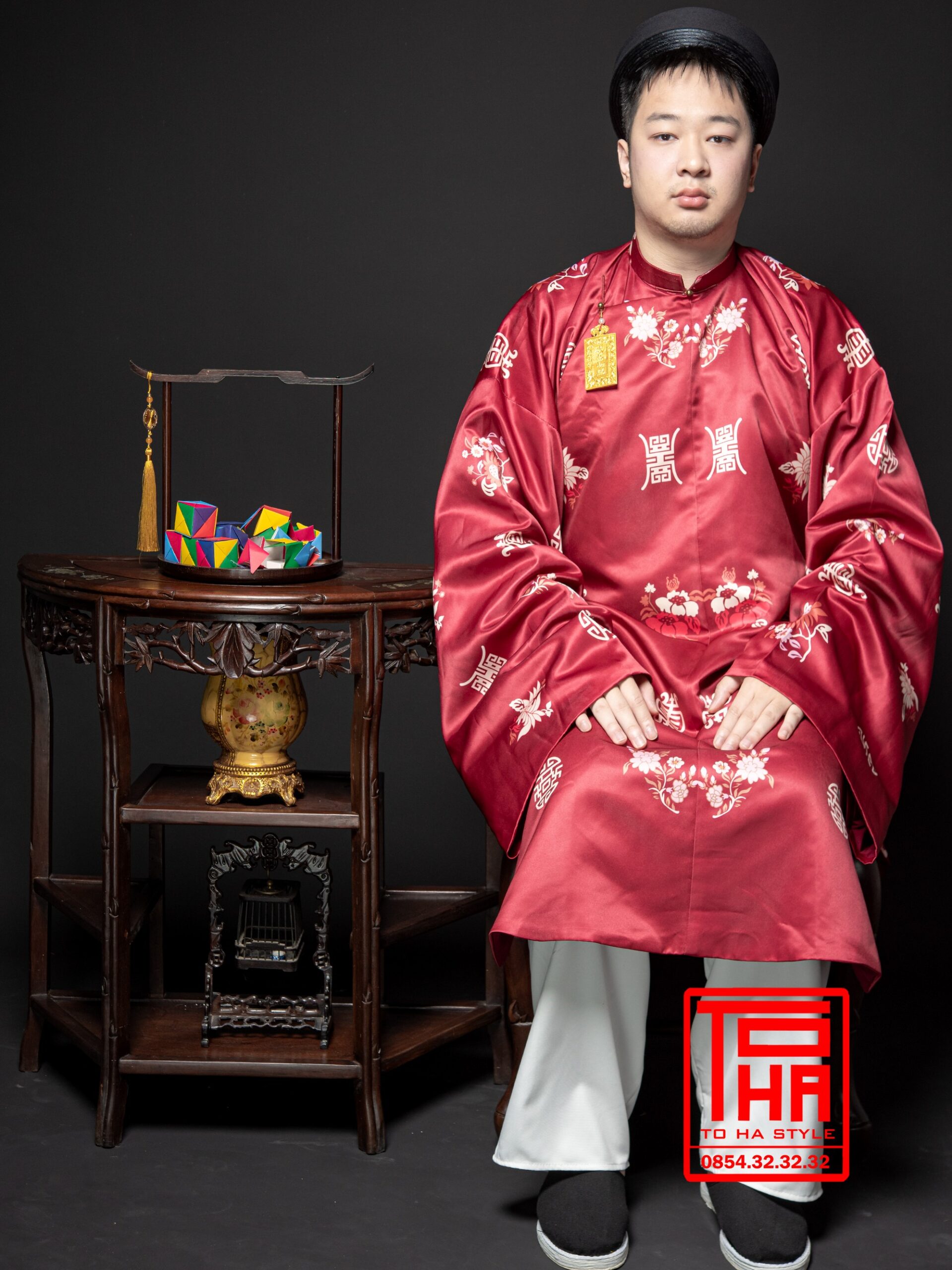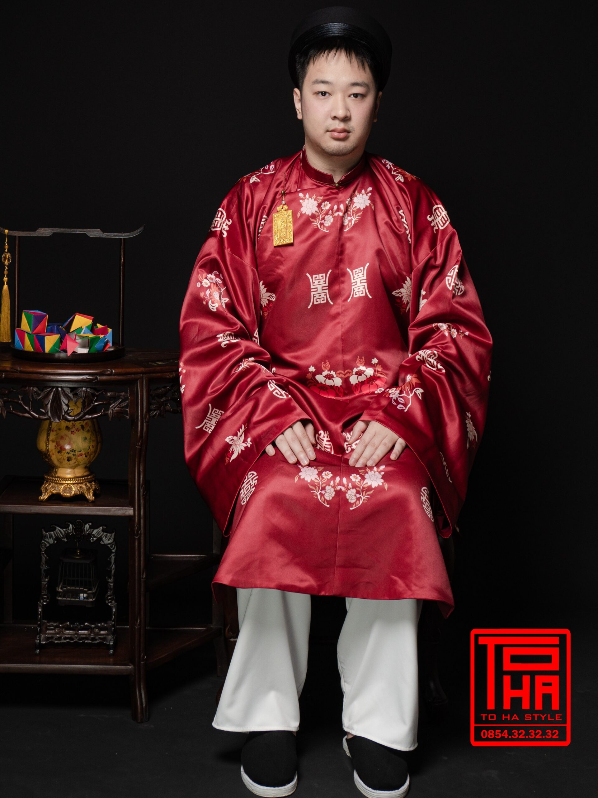 Cho thuê bộ áo Tấc nam – đỏ đô, vải tafta in họa tiết Phúc Thọ Mẫu Đơn