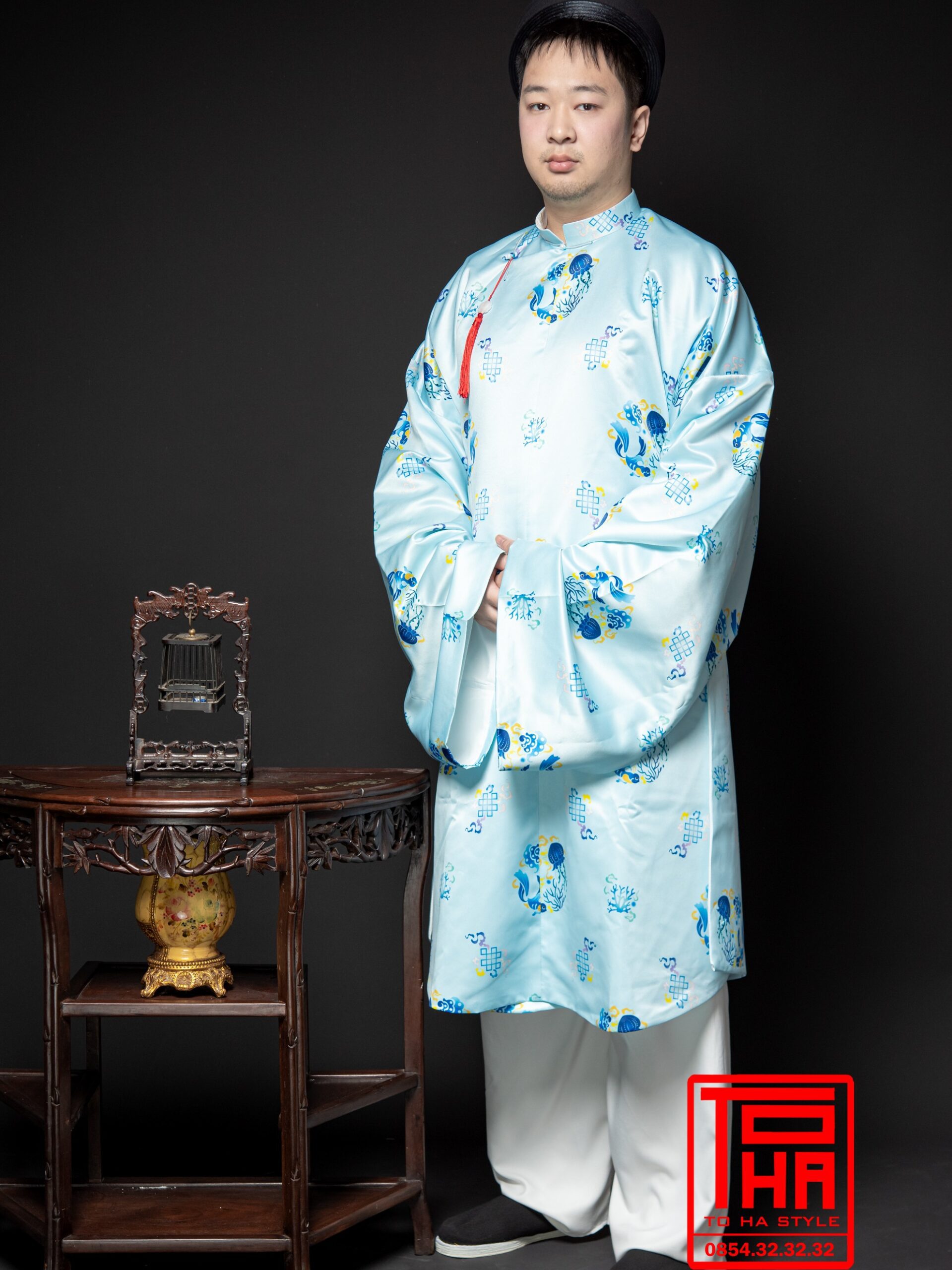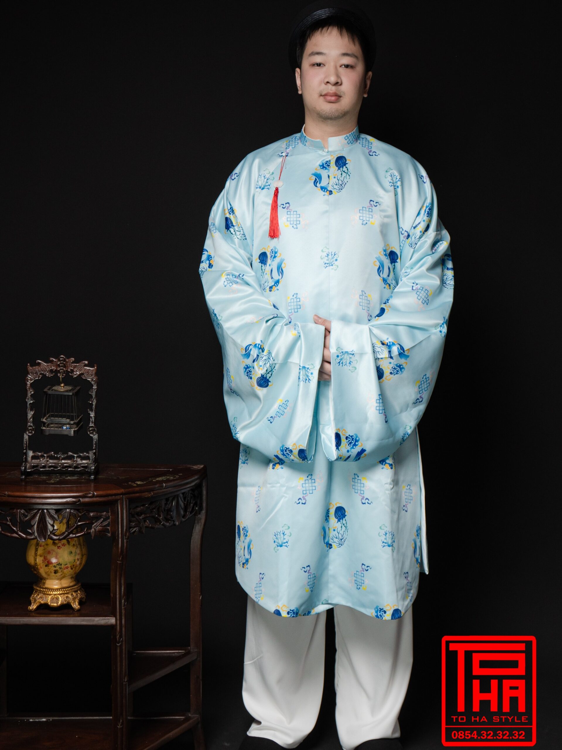 Cho thuê bộ áo Tấc nam – xanh ngọc lam nhạt, chất vải tafta in họa tiết hải ngư thủy mẫu