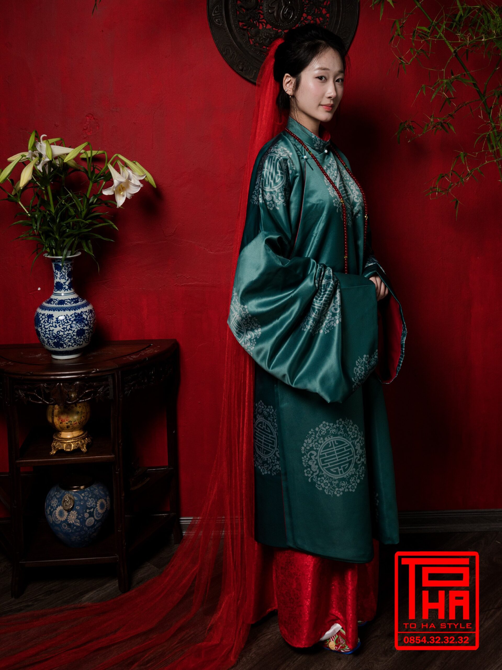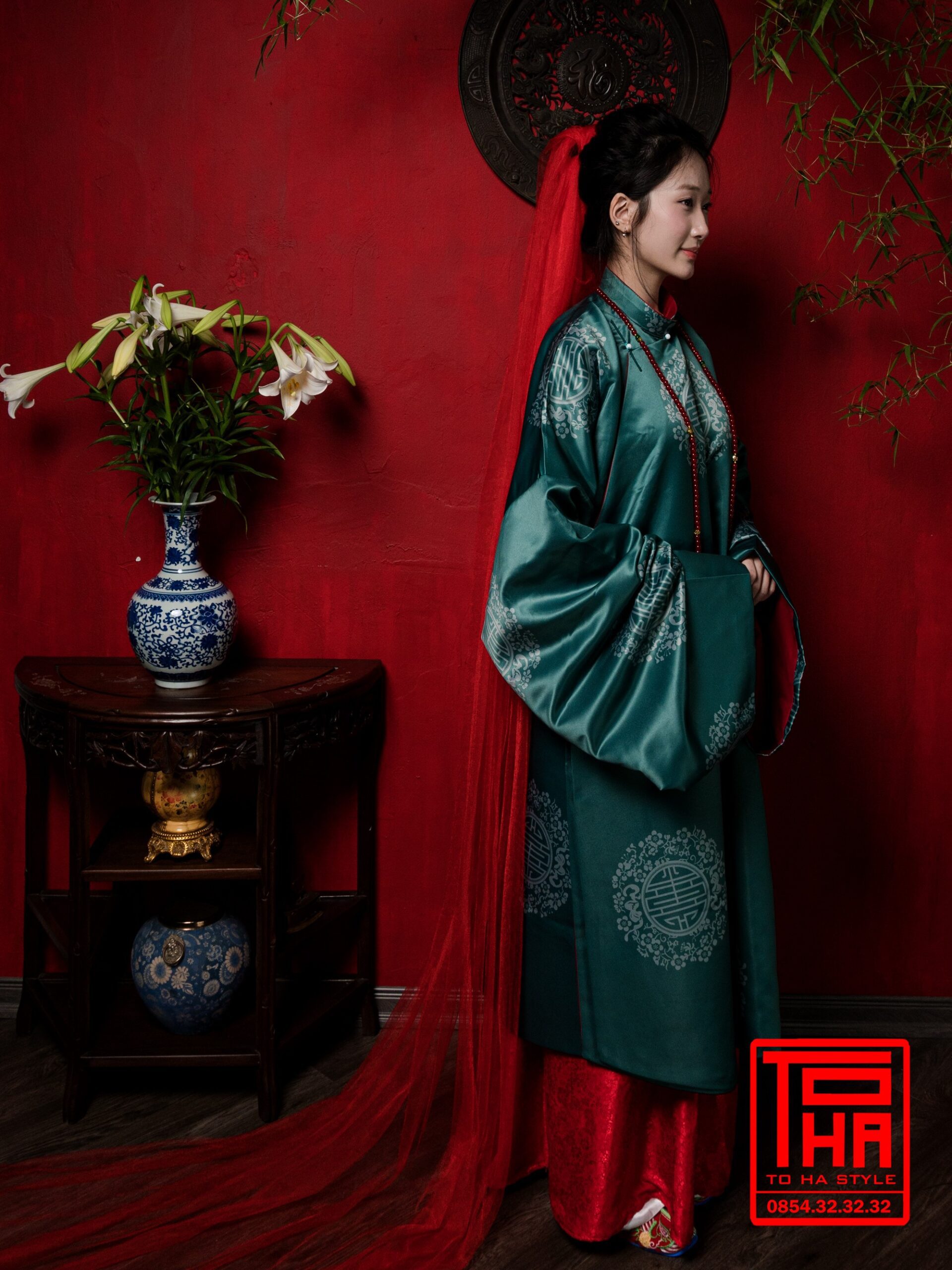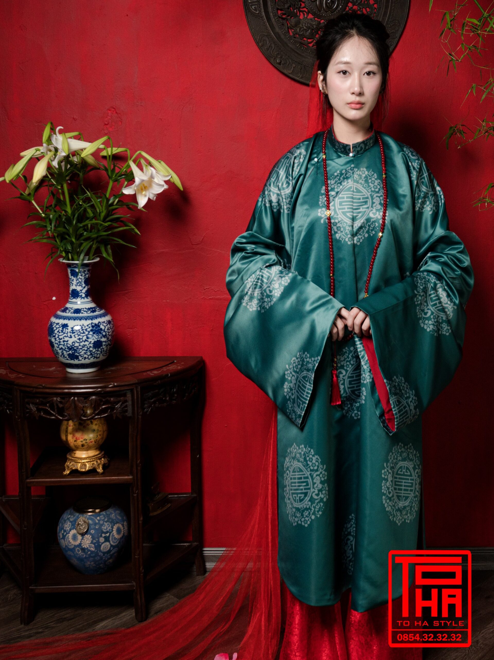 Cho thuê bộ áo Tấc – xanh lục bảo, vải tafta in họa tiết chữ Thọ